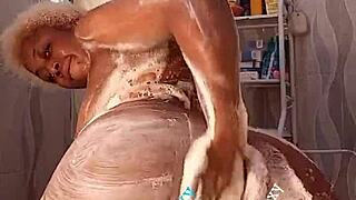 natural ebony woman taking a relaxing shower at home with some playful moments