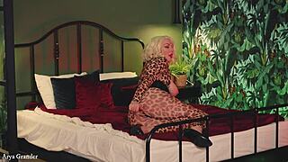 mature blonde poses in tight spandex catsuit on bed